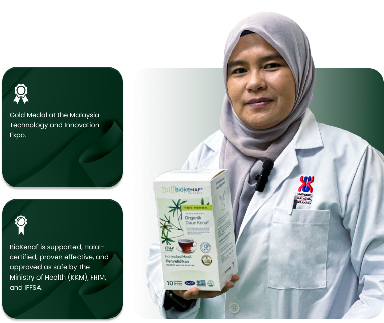 We have won multiple Gold Medals at the Malaysia Technology and Innovation Expo. Extensive local research confirms that our Kenaf extract is highly effective in relieving inflammation caused by obesity and high cholesterol. We are certified safe, effective, and Halal, with endorsements from the Ministry of Health (KKM), the Forest Research Institute Malaysia (FRIM), and the International Federation of Islamic Scholars Association (IFFSA).